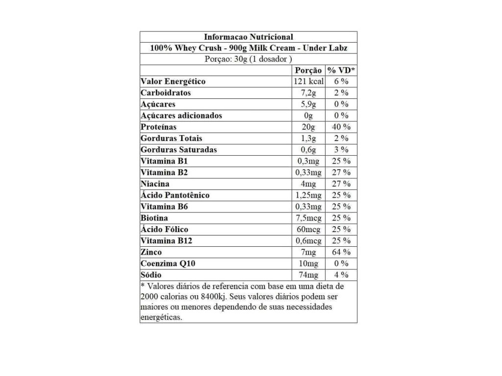 O 100% Whey Crush Concentrada Milk Cream 900g da Under Labz é um Whey Protein Concentrado de alta qualidade e sabor cremoso , desenvolvido para quem busca recuperação muscular eficiente, ganho de massa magra e um toque aconchegante no pós-treino . Com 20g de proteína por dose (30g de pó) , esse suplemento combina a eficácia do Whey Protein Concentrate com o sabor suave e marcante de creme de leite com baunilha (Milk Cream) — uma combinação doce, cremosa e clássica, perfeita para quem ama sabores tradicionais com toque premium e moderno.