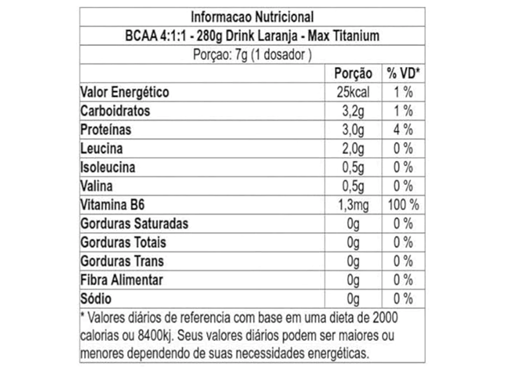 O BCAA 4:1:1 Drink da Max Titanium é um suplemento em pó composto por aminoácidos de cadeia ramificada na proporção de 4 partes de L-Leucina para 1 parte de L-Isoleucina e 1 parte de L-Valina. Formulado para auxiliar na recuperação e no ganho de massa muscular, cada porção de 7g fornece 3g de BCAAs e 100% da Ingestão Diária Recomendada (IDR) de vitamina B6, essencial para o metabolismo proteico. Disponível no sabor laranja, é uma opção prática e saborosa para complementar a dieta de atletas e praticantes de atividades físicas.