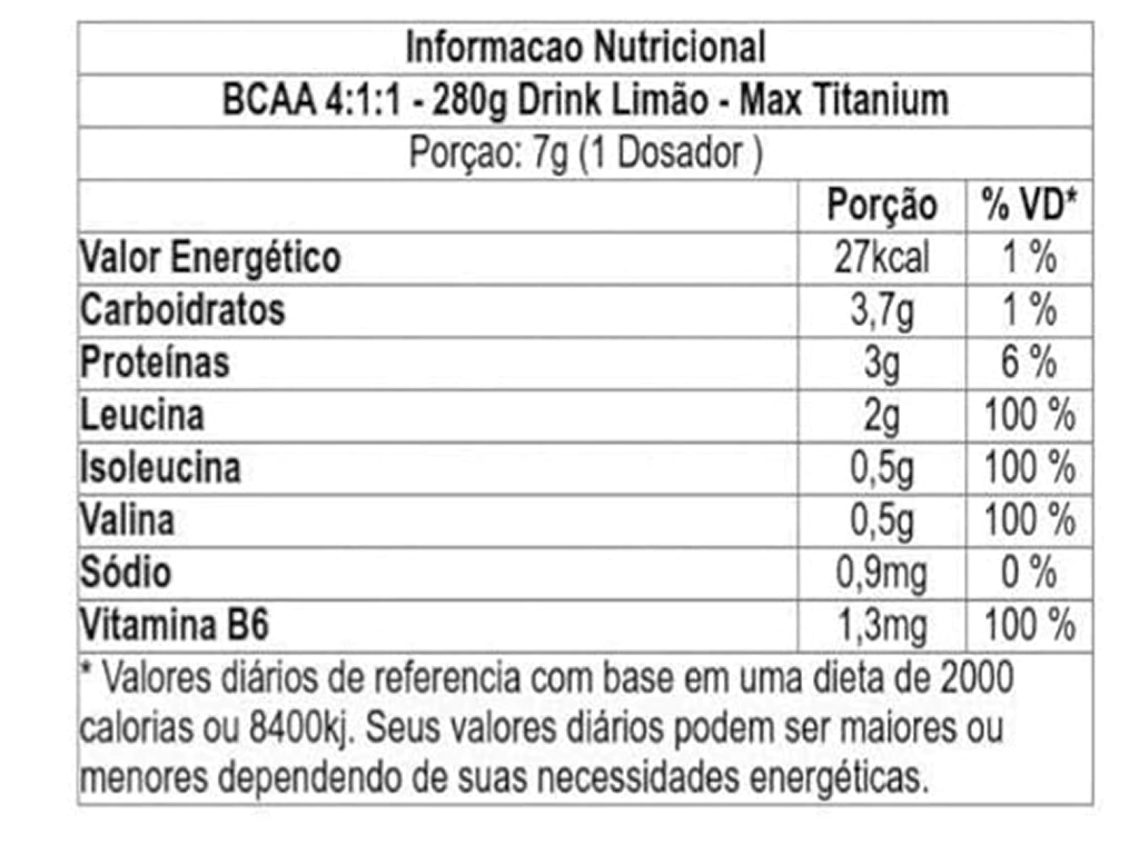 O BCAA Drink 280g Sabor Limão da Max Titanium é um suplemento em pó formulado para auxiliar na recuperação e no ganho de massa muscular. Este produto contém aminoácidos de cadeia ramificada (BCAAs) na proporção de 4 partes de L-Leucina para 1 parte de L-Isoleucina e 1 parte de L-Valina. Cada porção de 7g fornece 3g de BCAAs e 100% da Ingestão Diária Recomendada (IDR) de vitamina B6, essencial para o metabolismo proteico. Disponível no sabor limão, é uma opção prática e saborosa para complementar a dieta de atletas e praticantes de atividades físicas.