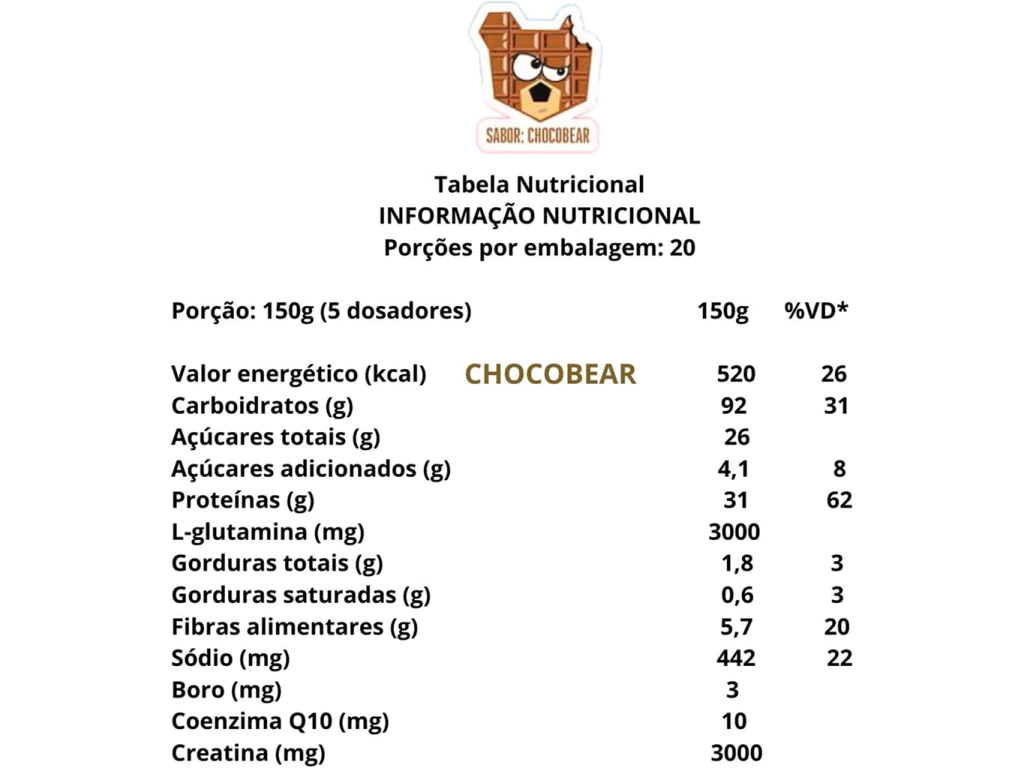 O Captain Gainer Chocobear 3kg da Under Labz é a combinação perfeita entre performance e prazer. Com 30g de proteína, 95g de carboidratos e o sabor inconfundível de chocolate com ursinho de goma, oferece energia sustentada, recuperação acelerada e ganho de massa muscular — tudo em um pote de 3kg com rendimento prolongado, ideal para quem vive no limite e precisa de combustível de elite com sabor de infância.