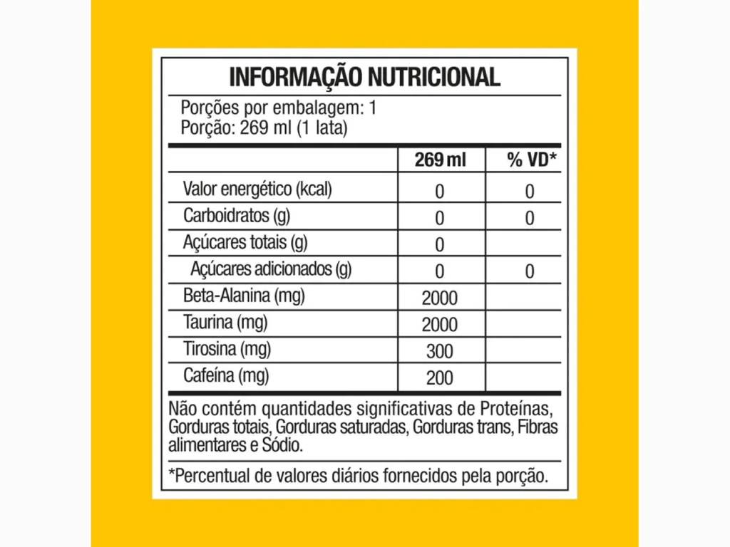 - Cafeína anidra (200mg por lata) – energia limpa, alerta máximo e redução da fadiga