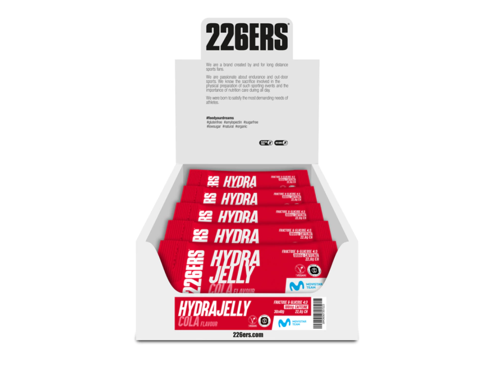 O HydraJelly Cola 40g da 226ERS é um suplemento energético em gel desenvolvido para fornecer energia rápida e sustentada durante atividades físicas intensas. Com uma textura inovadora de gelatina e um delicioso sabor de cola, é ideal para esportistas que precisam de uma reposição eficiente de carboidratos e eletrólitos.