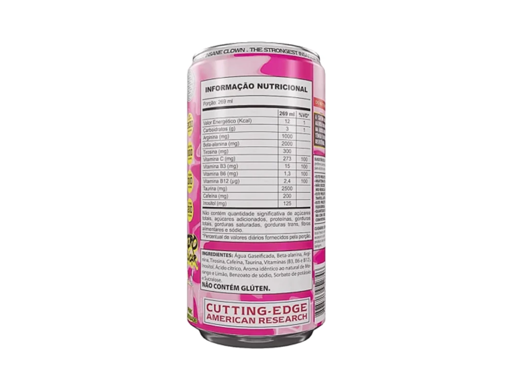 O Insane Clown Energy Pink Lemon é o choque cítrico que seu corpo pede. Com sabor ácido de limão rosa e fórmula de combate, combina energia extrema, foco laser e pump descomunal — tudo em uma lata pequena, mas com poder destruidor. Para quem treina como maníaco, vive no limite e não aceita limites.