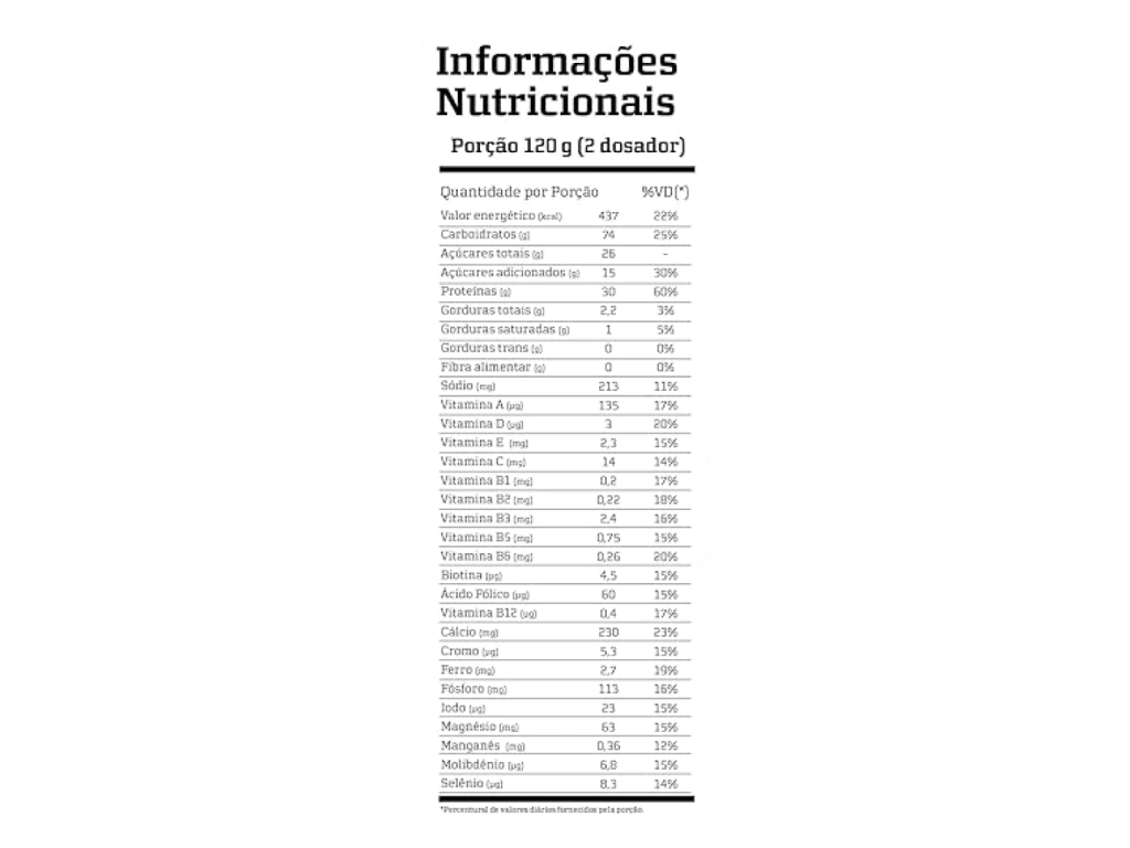 Diluir 120g (4 scoops) em 300ml de água gelada ou leite. Consumir de 1 a 2 vezes ao dia, preferencialmente após o treino e/ou entre as refeições, conforme orientação de nutricionista ou médico.