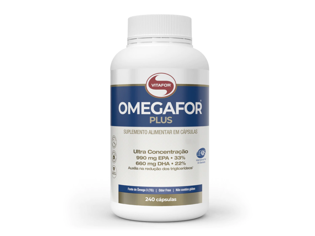 O OMEGAFOR Plus 240 cápsulas da Vitafor é um suplemento alimentar à base de óleo de peixe concentrado em ácidos graxos essenciais do tipo ômega-3 (EPA e DHA), com elevada pureza e concentração. Sua formulação é ideal para auxiliar na saúde cardiovascular, cerebral, ocular e na modulação de processos inflamatórios. Cada cápsula contém óleo de peixe com alta concentração de EPA e DHA, extraído por tecnologia de destilação molecular, o que garante maior qualidade e segurança. Indicado para uso contínuo, o Omegafor Plus oferece suporte nutricional para todas as fases da vida com excelente biodisponibilidade.