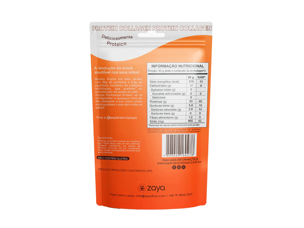 O Parmezaya Protein 50g da Zaya é um snack proteico inovador e gourmet, que combina o sabor intenso do queijo parmesão com uma base proteica de alto valor biológico, criando uma experiência crocante, salgada e funcional — perfeita para quem busca uma opção saudável, prática e saborosa no lugar de salgadinhos ultraprocessados. Ideal para o lance da tarde, pós-treino ou como substituto de petiscos calóricos, este snack é livre de glúten, zero açúcar e rico em proteína.
