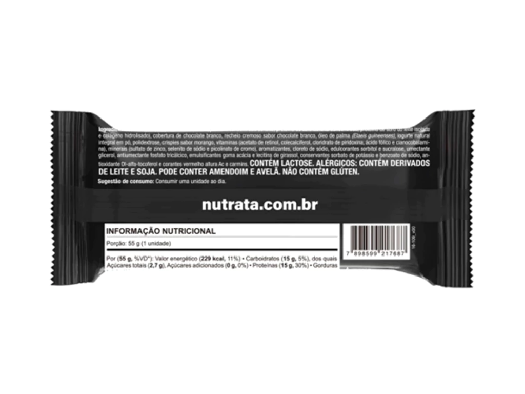 - Textura macia e crocante (com pedaços de morango ou crocantes de proteína)